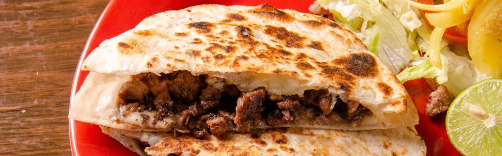 A base de 2 tortillas de harina, rellena de 120 g de proteína gratinada con queso y cebolla y cilantro, acompañada de 100 g de papas a la francesa y 1 pza de chile toreado.